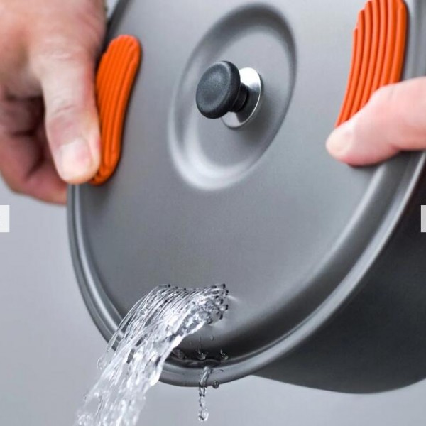 - 鍋蓋上有矽膠隔熱墊,讓使用濾孔時安全不燙手