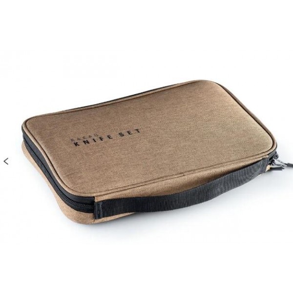 Rakau 刀具七件組包含了三支廚刀、一個竹砧板、一個磨刀器、一塊擦拭布、一個收納袋。不鏽鋼刀具組設計堅固、耐用,可世代相傳。廚師刀具有格蘭頓刀片,可優雅地用於切薄片。鋸齒狀麵包刀可處理最堅硬的法式麵包,削皮刀可巧妙地穿過酥脆的果核。整組套裝可收納在由再生 PET 製成的收納包中,刀具皆有附刀套,用於保護和安全管理刀具。
