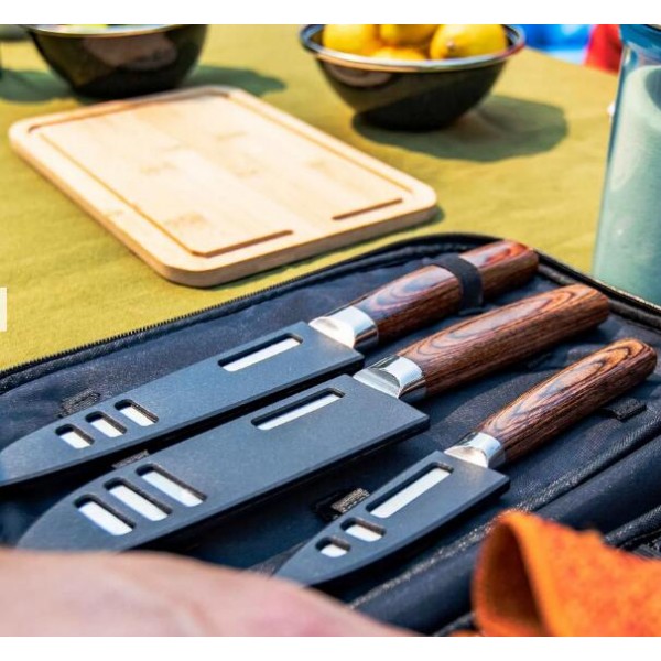 內含:4吋日式削皮刀x1,6吋日式廚師刀x1, 6吋日式麵包刀x1,竹製砧板x1,磨刀器x1,擦拭布x1,尼龍收納袋x1
