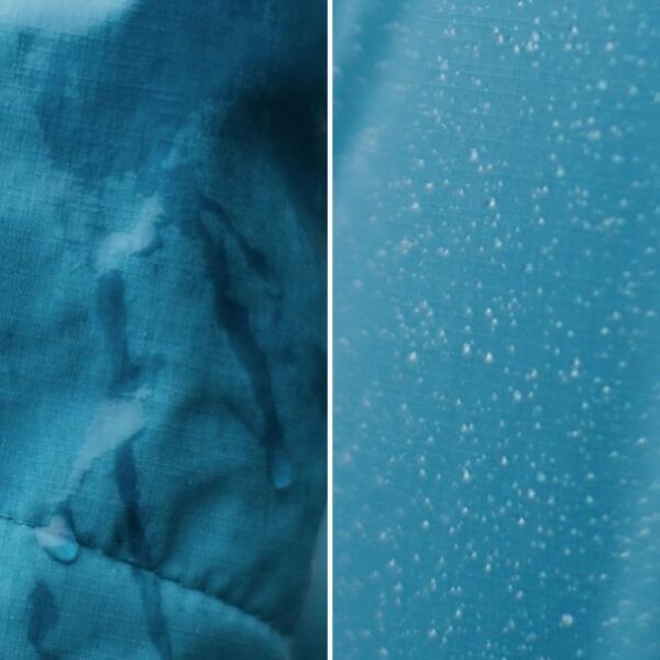 - 耐用性: DWR噴劑處理後因為表面張力得到改變,雨水接觸表布後也會直接滑落,透氣不受阻礙,並恢復耐磨耗、防水、防油以及抗汙的特性